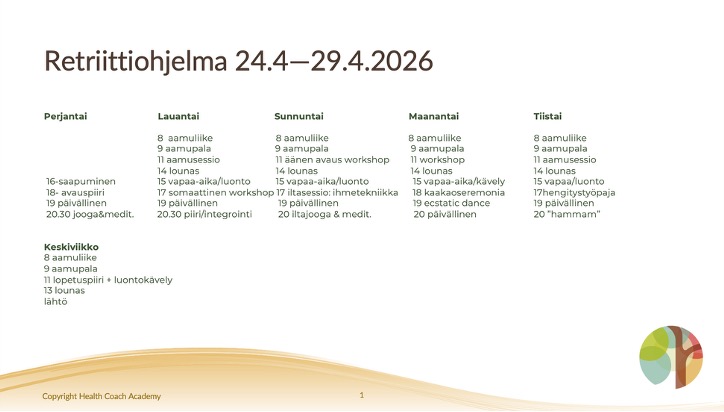 Oheisesta kuvasta näet retriitin alustavan ohjelman (muutokset mahdollisia):